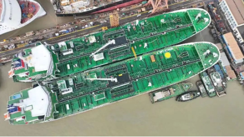 中国船舶集团旗下广船国际建造的国内首型甲醇双燃料动力船2艘姊妹船肩并肩!