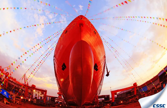 黄埔文冲建造的1400TEU双燃料集装箱船即将下水,美丽的船船与娴丽多彩的天空融为一体,展现出一幅展翅欲飞场景。
