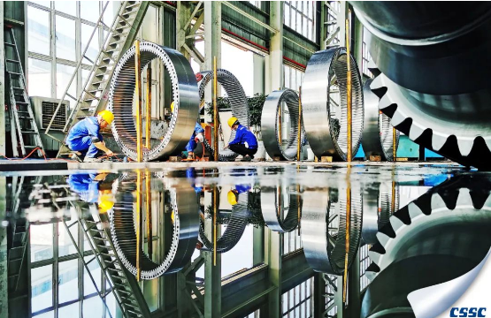 重齿公司工人们正在对风力发电机内齿圈进行清洗及外观检查,而这叠映丛生的大小齿轮却构建出无与伦比的美妙景象。