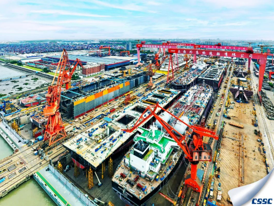 在高压防疫状态下,全面推进复工复产,船坞码头开足马力建造,船坞中民船、海工、邮轮并排建造。