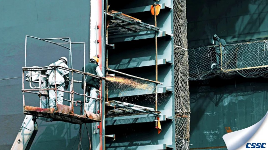 在30万吨VLCC施工现场,大船人正在进行艏艉两大段合拢口部位的精度修正作业。该作业方式是大船集团经过多年建造经验,通过三维数据管理、吊装精度控制、环形段高精度切割等多种多部门协调后达到一次对接,标志大船集团已完全掌握高难度高精度的合拢方式,在国际上富有极高的竞争力。