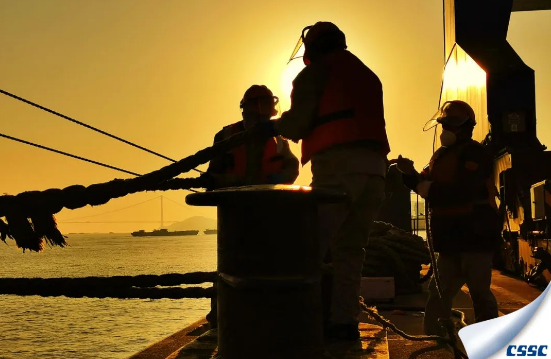 迎着朝阳,中船澄西船舶修造有限公司的带缆工人们齐心协力,正在为一艘化学品船离泊解缆。