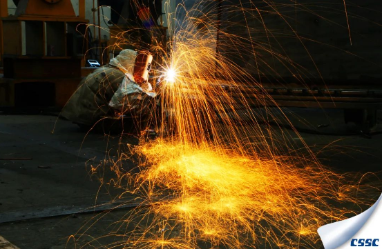 我不知道你是谁,我却知道你为了谁。中国船柴宜柴公司钢构厂一名电焊工为了保节点、抢进度,正在加班加点焊接产品。