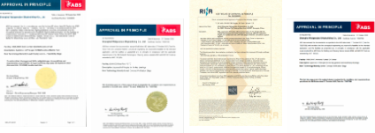 从左至右依次为21万吨纽卡斯尔型甲醇燃料动力散货船、9200车双燃料动力汽车运输船(PCTC)、创新型30万吨原油轮(VLCC)、115万载重吨氨燃料油轮的AIP证书