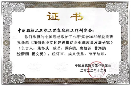 近日,由中国船舶工业职工思想政治工作研究会申报的中国思想政治工作研究会2022年委托课题《加强丝袜av建设,推动企业高质量发展研究》评审结果公布,成果优秀,报经中央宣传部领导审定准予结项。这是中国船舶政研会首次承担中国政研会委托课题并获评优秀。