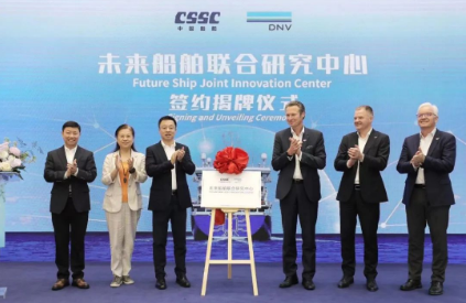 6月19日,中国船舶集团旗下上海船舶研究设计院(简称上船院)与DNV集团旗下挪威船级社中国有限公司(简称DNV)联合创建的中国首个“未来船舶联合研究中心”在上海正式揭牌,共同打造国际化技术创新合作平台。这是双方携手推动战略合作关系逐步走深、走实的又一重要举措,也是具有里程碑意义的全方位战略合作又一成果,必将成为全球海事应对脱碳与数字化转型开展前瞻性地国际化协作的典范。中国船舶集团党组成员、副总经理盛纪纲,DNV海事首席执行官柯努特(Knut Ørbeck-Nilssen)为联合研究中心揭牌并致辞。