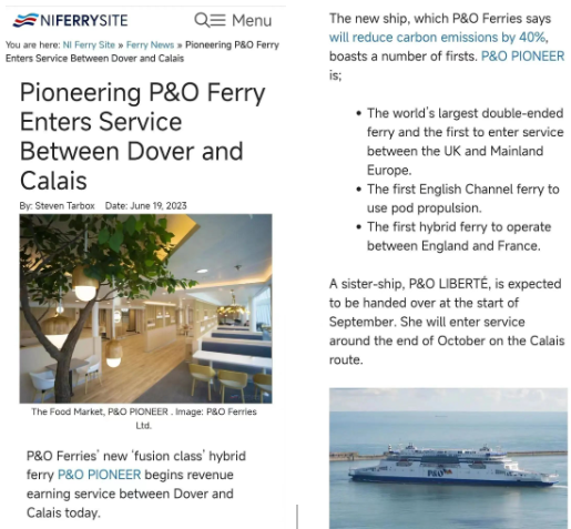 由于“P&O Pioneer”不必掉头,每次航线将节省7分钟的时间和近60%的燃料消耗,从而能在同样的航行时间下降低航行速度、燃料消耗和排放。“P&O Pioneer”的首航标志着英法航线进入了绿色低碳的新时代。