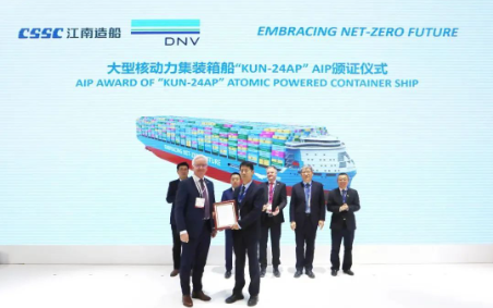 全球首型、世界最大24000箱核动力集装箱船船型发布,挪威船级社(DNV)颁发了该船型的原则性认可证书。