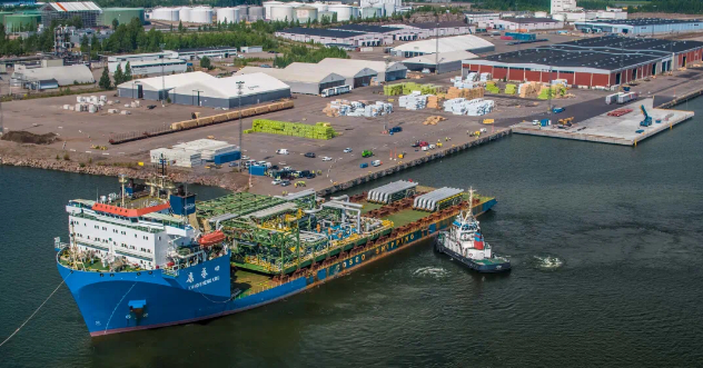 “祥泰口”号甲板面积接近两个标准足球场大小,船上配置4台4000千瓦中压发电机组,总功率近16 兆瓦。