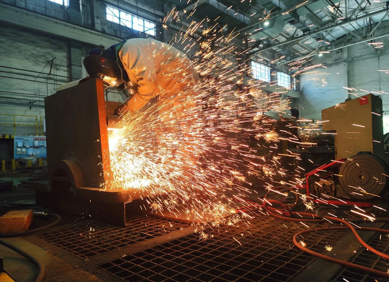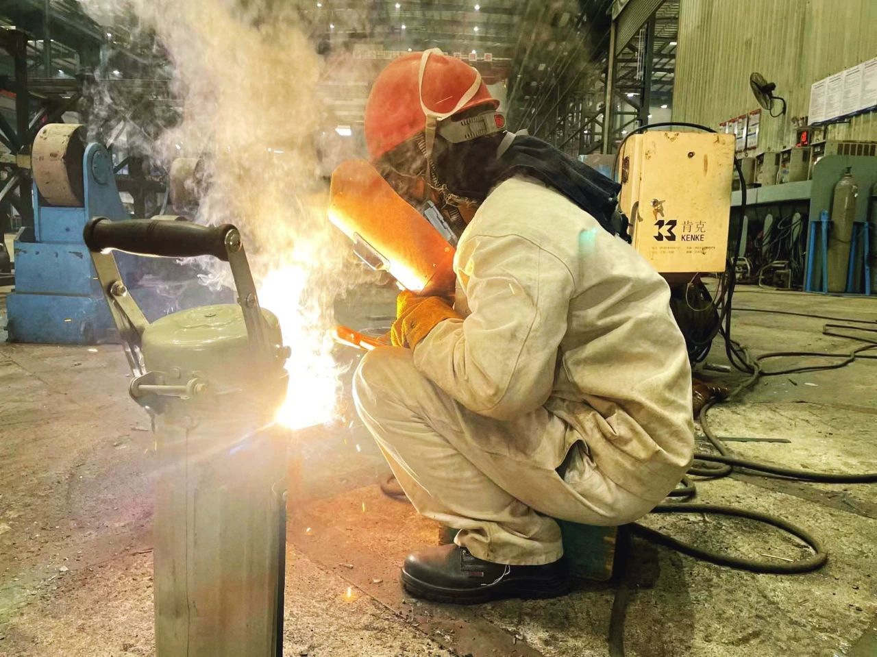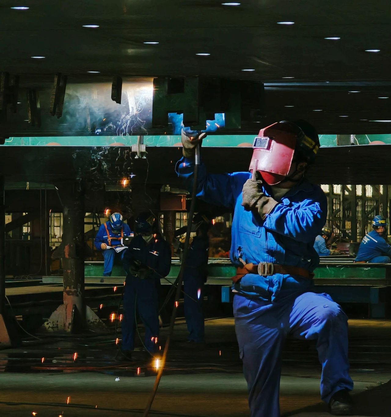 武汉船机——钢构制造部员工穿着厚厚的防护服进行焊接工作。