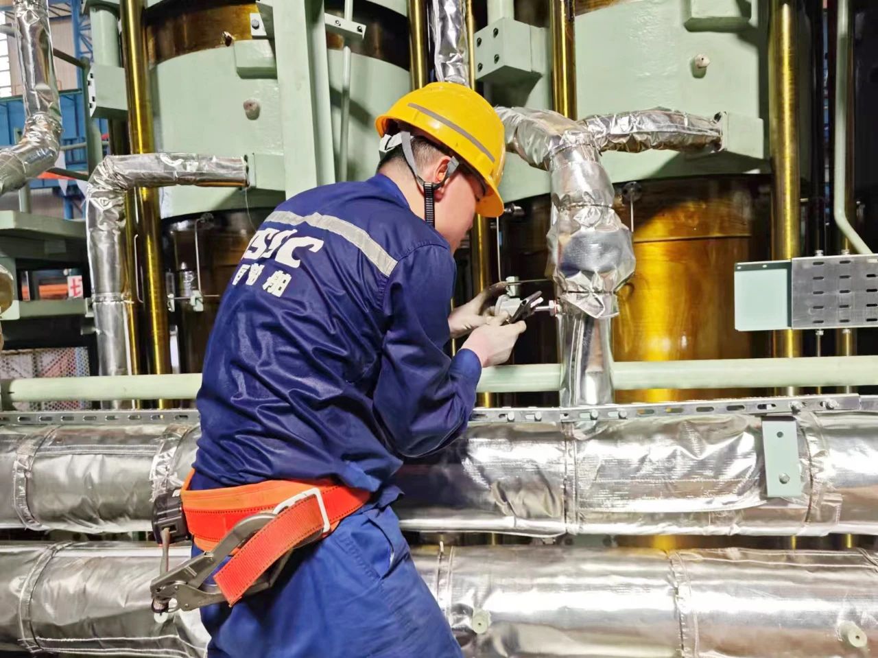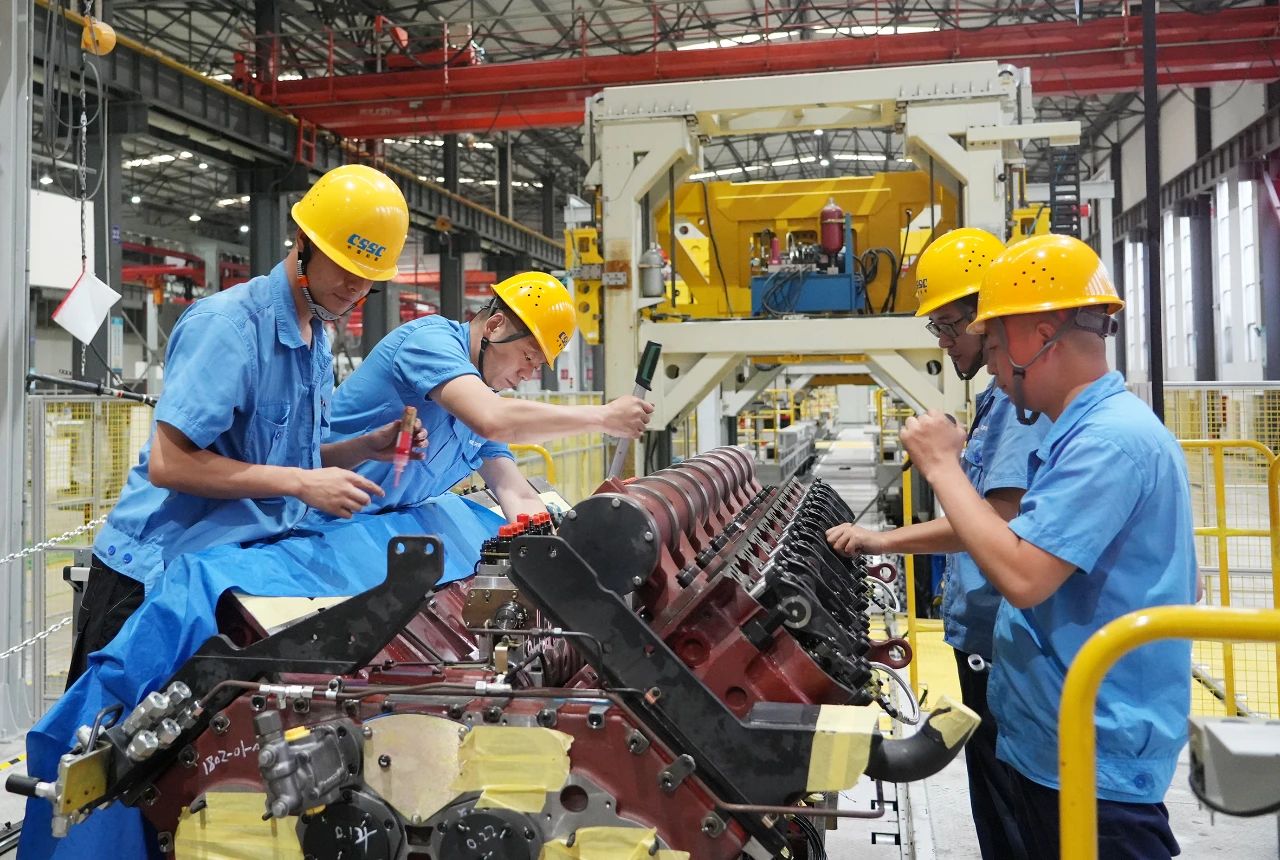 中船发动机——调试人员顶着高温在认真安装传感器,汗水湿透了衣裳。