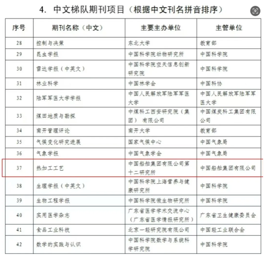 近日,中国科技期刊卓越行动计划二期(2024—2028年)入选结果公布,由中国船舶集团有限公司主管、中国船舶集团第十二研究所和中国造船工程学会联合主办的《热加工工艺》期刊,成功入选“中文梯队期刊”项目。这也是中国船舶集团唯一成功入选卓越行动计划二期的期刊。