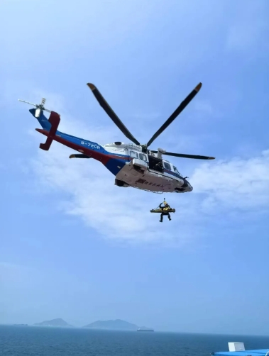 接报后,广船国际立即启动航空救援,第一时间联系海上航空救助和最近的珠海医院,一场生死竞速在南海的碧海蓝天间极速展开!在交通运输部南海第一救助飞行队、珠海市中山大学附属第五医院和试航项目组的通力协作下,半小时后,蓝白相间的救援直升机飞临悬停试航船舶的直升机平台。