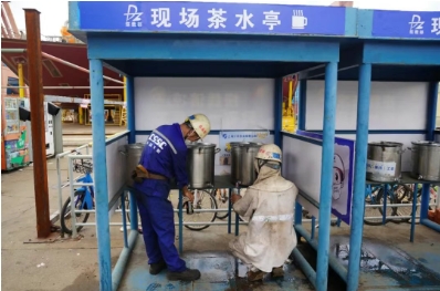 江南造船为一线员工送棒冰、盐汽水、酸梅汤、水壶等物资,食堂开设绿豆汤专供窗口,生产区域设置115个大麦茶供应点,遍布各车间、码头、休息区;提前策划,按就近、共享以及区域化管理原则,新增职工小家,开放办公楼宇和食堂,设置高温休息点。