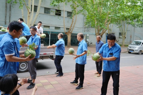 “这西瓜真新鲜!”“今年的西瓜肯定甜!”一个个滚圆的西瓜递到职工们汗湿的手中,大家边卸西瓜边聊天,现场传来阵阵欢笑。此前,中船河柴已为一线职工发放绿豆、冰糖等防暑降温用品,在生产现场安排专人熬煮绿豆汤,及时有效服务职工。接下来,中船河柴将结合天气情况,动态调整“送清凉”计划,分批次发放防暑降温物资,为夏季安全生产提供坚强保障。