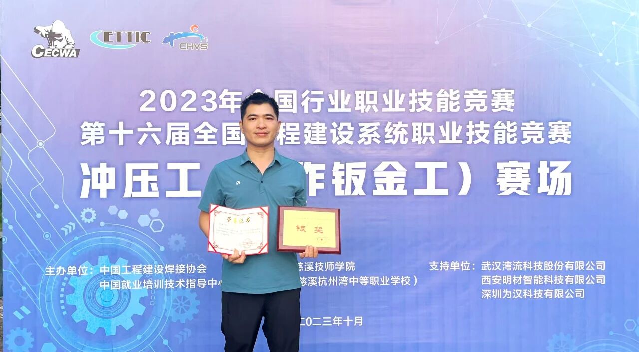 在技能竞赛舞台上,邹彬是公认的“金牌教练”。自2014年起,他连续担任第43至47届世界技能大赛全国选拔赛建筑金属构造项目广东省队教练组长。在他的悉心指导下,培养选手累计荣获省级及以上奖项21项。郑江华等4人入选世赛国家集训队,谢艺科、吴志平等6人夺得省级职业技能大赛第一名,郑江华等人获评“全国技术能手”“广东省技术能手”。2023年,他本人也在全国行业职业技能竞赛中斩获“冲压工·冷作钣金工”项目银奖,并获评“全国工程建设系统技术能手”。