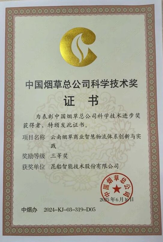 旗下昆船公司所属昆船智能协同相关单位及高校申报的“云南烟草商业智慧物流体系创新与实践”项目成果获得中国烟草总公司科技进步奖三等奖。