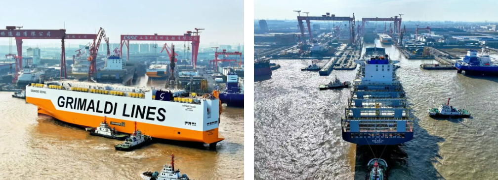 12月16日,中国船舶集团有限公司旗下外高桥造船建造的9000车汽车运输船H1608和7000TEU集装箱船H1353从一号船坞出坞。至此,外高桥造船实现了一号船坞、二号船坞年度各八批次、共计24艘船舶的出坞任务,在超额完成年度交船目标的基础上,以领跑姿态圆满完成“十四五”收官,顺利开启“十五五”新征程。
