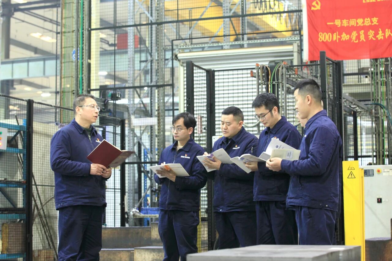 首席技师傅国涛,在班前会上为工友们宣讲党的二十届四中全会精神,认真学习全会提出的“加快建设制造强国”重要部署,让党的二十届四中全会精神进基层进班组,为企业高质量发展贡献力量。