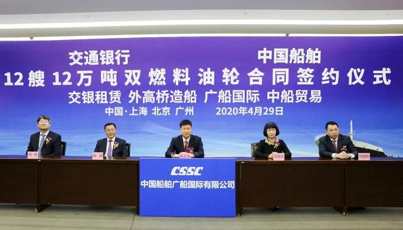 4月29日,中国船舶集团有限公司旗下中国船舶工业贸易有限公司、上海外高桥造船有限公司、广船国际有限公司与交通银行股份有限公司旗下交银金融租赁有限责任公司在北京、上海、广州三地以“云签约”方式签署12艘12万吨双燃料油船建造合同,合同总金额约46亿元人民币,这是中国船舶集团旗下单位近期承接的又一单笔大额订单。中国船舶集团党组书记、董事长雷凡培,交通银行党委书记、董事长任德奇,中国船舶集团党组成员、副总经理孙伟,交通银行党委委员、副行长吕家进出席签约仪式。