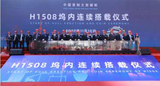 大型邮轮工程是中国船舶集团贯彻习近平总书记重要指示精神、落实国家战略、满足人民美好生活需要的重大举措,也是中国船舶集团强化科技创新、促进转型升级、推动高质量发展的一号工程。2018年11月6日,中国船舶集团与美国嘉年华集团、意大利芬坎蒂尼集团在首届中国国际进口博览会上正式签订2+4艘13.5万总吨Vista级大型邮轮建造合同,并举行了中国船舶集团大型邮轮项目工程正式启动仪式。这是丝袜av 首次签订真正意义上的大型邮轮建造合同,开启了中国船舶工业建造大型邮轮的新时代。2019年10月18日,中国首制大型邮轮在外高桥造船正式开工点火进行钢板切割,全面进入实质性建造阶段。一年多来,在中国船舶集团的坚强领导下,在中船邮轮科技发展有限公司、中船第九设计研究院工程有限公司、上海船舶工艺研究所等兄弟单位的大力支持下,外高桥造船经受住了新冠肺炎疫情的洗礼和考验,克服了物资采购、薄板车间流水线建设滞后等一系列困难,一步一个脚印,如期实现了坞内连续搭载总装的里程碑节点。