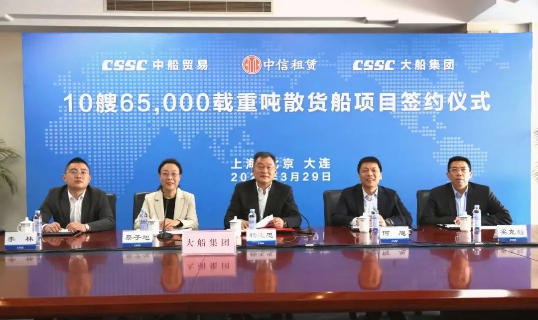 3月29日,中国船舶集团旗下中船贸易联合大船集团与中信金融租赁有限公司以“云签约”的形式正式签署10艘6.5万吨散货船新造船合同。该批船舶完工交付后将租赁给国内一流航运公司,服务国家资源能源运输,主要运营国内沿海航线及长江沿线。