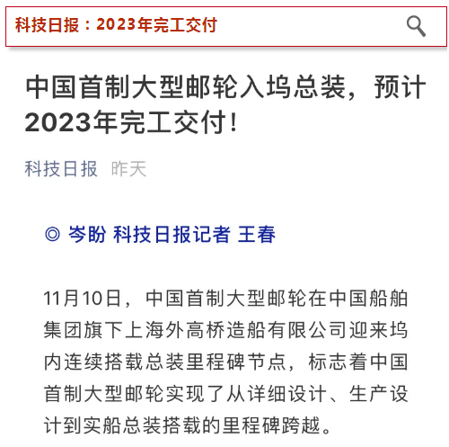 中国首制大型邮轮的入坞,标志着中国船舶集团在大型邮轮领域实现了从详细设计、生产设计,到实船总装搭载的重大跨越,也标志着中国船舶工业在摘取“皇冠上最后一颗明珠”方面,又迈出了坚实的一大步。