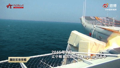 2015年7月,辽宁舰首次组织实弹射击,取得全部命中的好成绩。