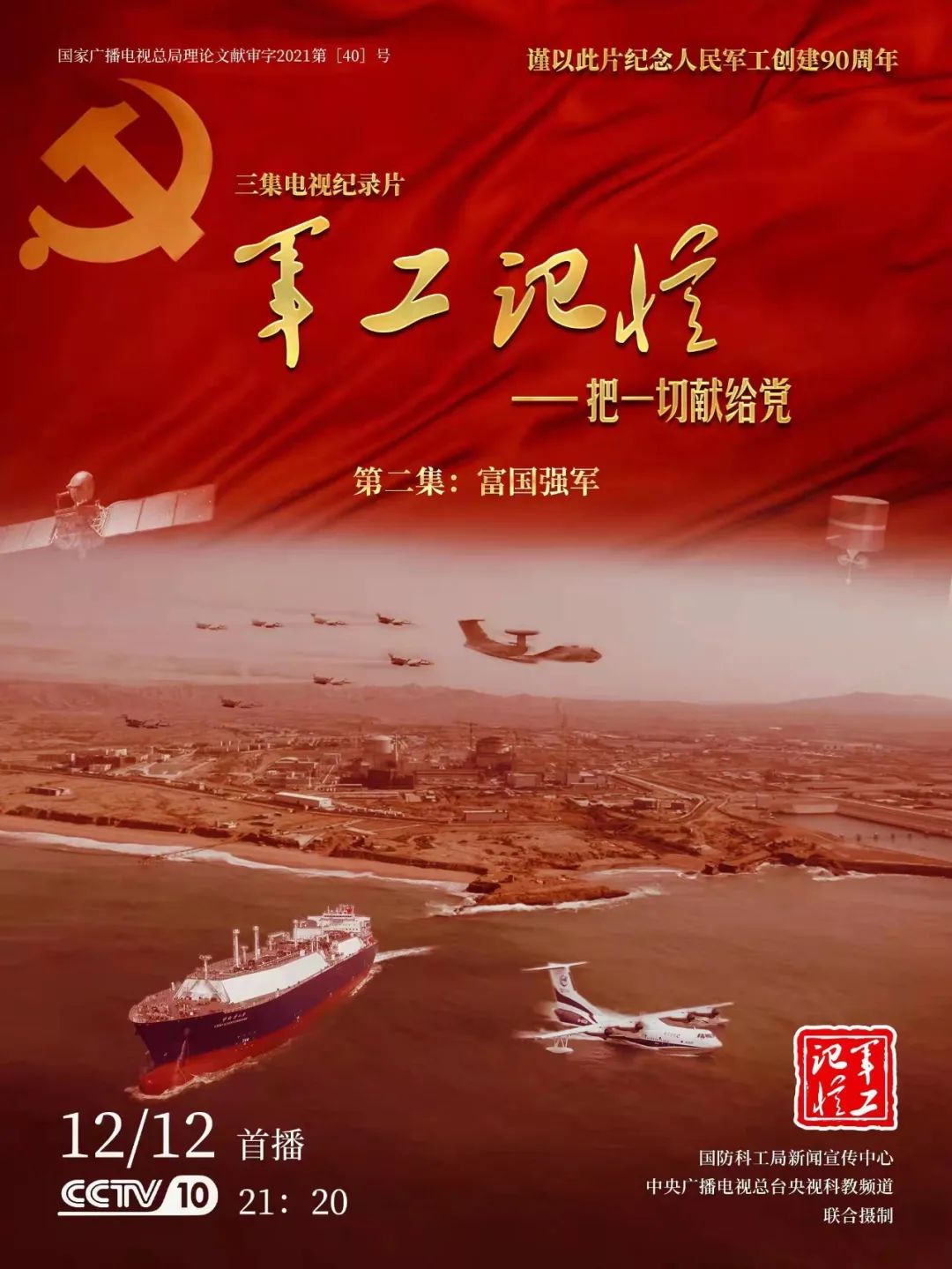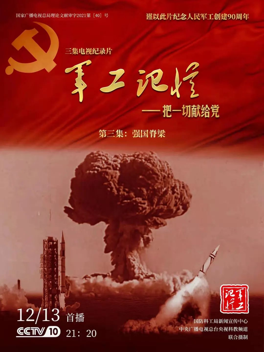 为庆祝中国共产党成立100周年,纪念党领导下的人民军工创建90周年,由国防科工局指导,国防科工局新闻宣传中心联合中央广播电视总台社教节目中心摄制,各军工集团大力支持的3集重大理论文献电视纪录片《军工记忆——把一切献给党》,将于12月11日21:20在央视科教频道(CCTV-10)《探索发现》栏目首播,连续播出3天。该纪录片旨在向建党百年献礼,向人民军工90周年致敬,向全社会弘扬军工精神传递军工文化,激励国防科技工业战线广大干部职工不忘初心、接续奋斗,为实现强军强国梦想贡献力量。