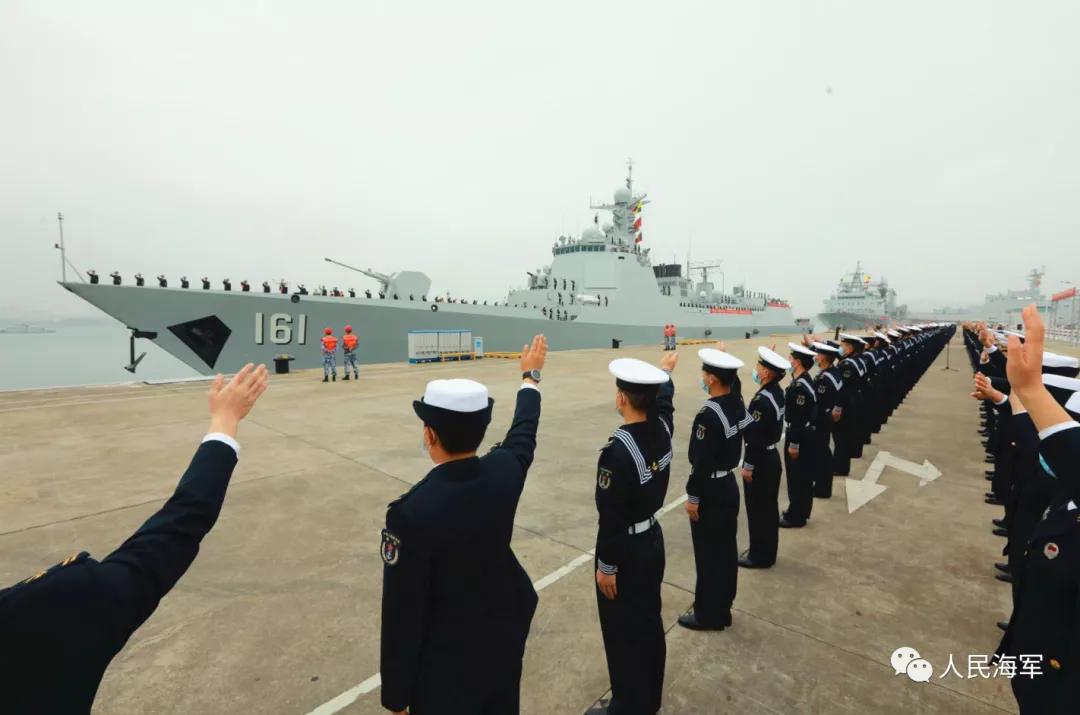 军乐队奏响《欢送进行曲》,编队舰艇依次解缆,缓缓驶离码头,任务官兵整齐列队、士气高昂,向祖国和人民挥手告别。