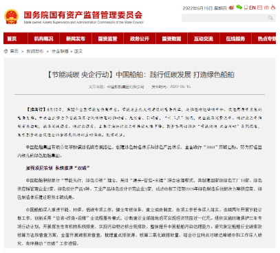 【编者按】6月13日,第32个全国节能宣传周开启。节能是生态文明建设的重要内容,是推进碳达峰碳中和、促进高质量发展的重要支撑。中央企业努力争当能源清洁低碳转型的推动者、先行者、引领者,“十三五”期间,央企能源消费总量、碳排放总量得到有效控制,能源消耗强度、碳排放强度、主要污染物排放总量持续大幅下降。6月16日,国资委网站在“节能减碳 央企行动”系列报道中,展示中国船舶集团有限公司促进社会绿色低碳的生动实践。