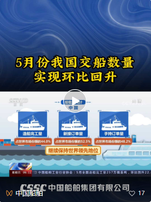 船舶工业生产经营逐步企稳回升。五月份,交船数量实现环比回升。