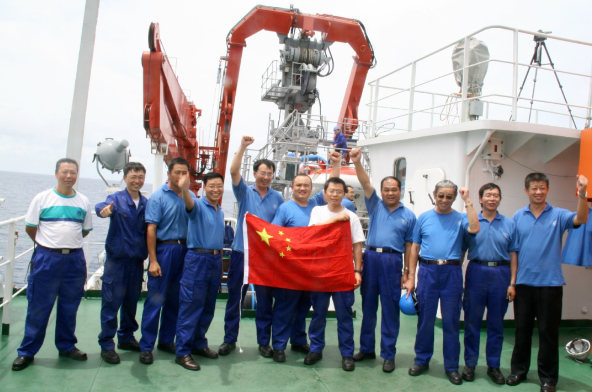 △蛟龙号下潜1000米海试合影 徐芑南(右三)、叶聪(中)