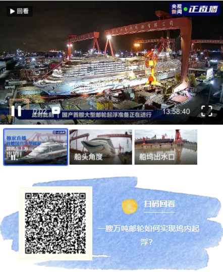 目前,船坞注水已经结束,邮轮已经起浮,将相继实现起浮、移坞和出坞,您也可以扫描下方图片中二维码,一键直达直播现场。