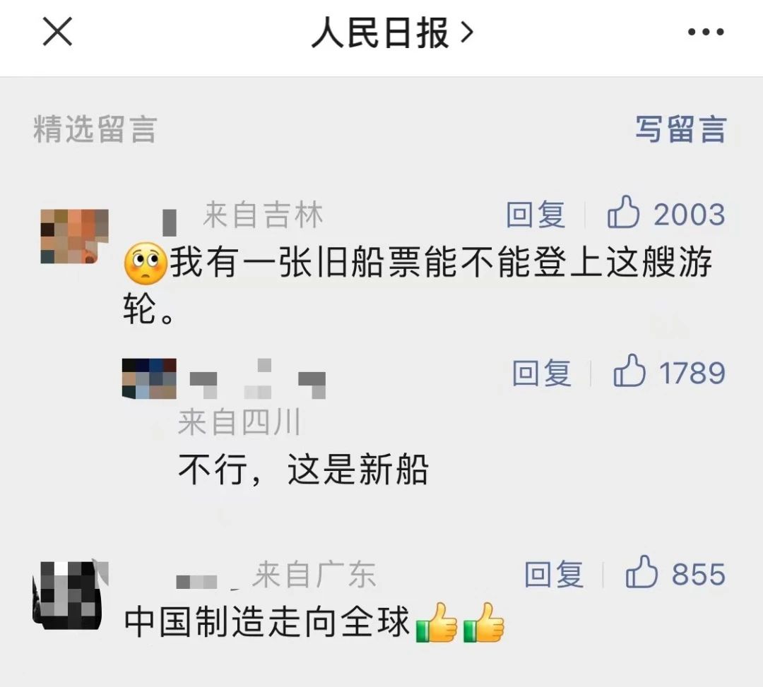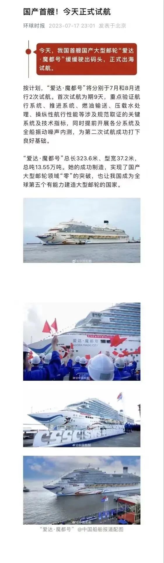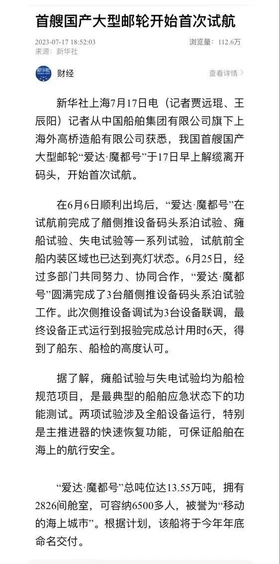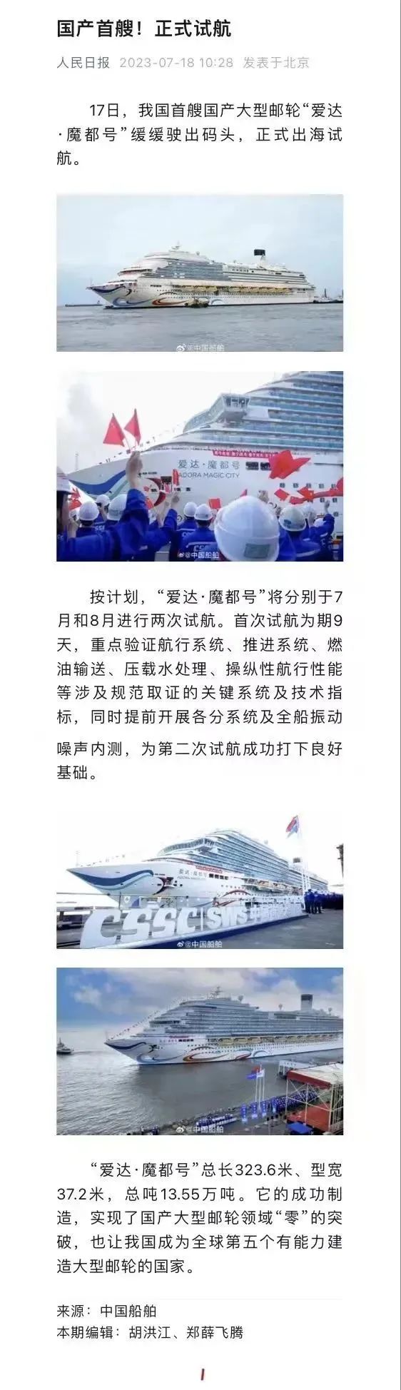 国产首制大型邮轮试航 各大媒体齐齐关注 ↓↓↓ 人民日报: 新华社: 央视新闻: 环球时报: 网友齐刷刷举起小手手: 要上船!要上船! 让我们一起期待 “爱达·魔都号” 试航凯旋!