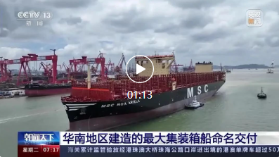 7月24日,由中国船舶集团旗下广船国际联合中船贸易建造的16000TEU集装箱船1号船命名交付,中央电视台《朝闻天下》进行了报道。