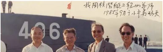 ▲黄旭华(右一)在“406”号弹道导弹核潜艇前的留影