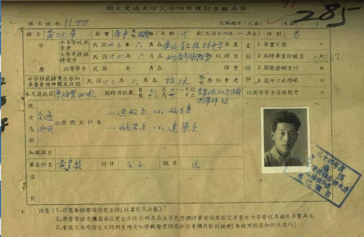 “国立交通大学”这所当时在科学技术领域全国首屈一指的学术殿堂,在黄旭华心中是神圣而遥远的。以至于当真正有机会填写被保送大学的名字时,他竟然没有勇气填上“国立交通大学”的名字,只填上了一个中央大学的航空系。