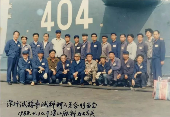 ▲黄旭华(后排左一)同参与深潜试验的科研人员合影(1988年4月30日摄)