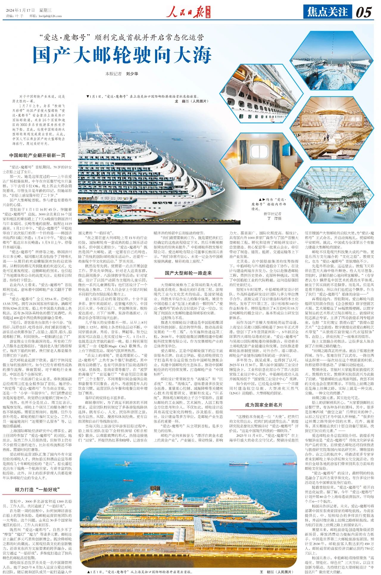 1月17日,人民日报海外版第五版焦点关注刊发整版文章,聚焦“爱达·魔都号”。