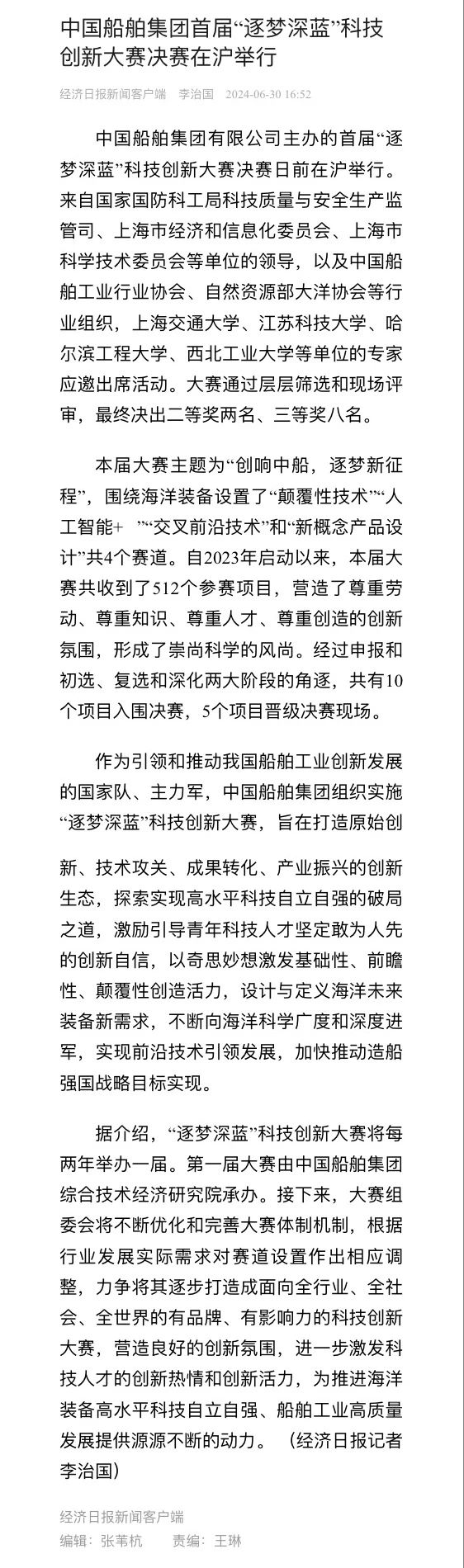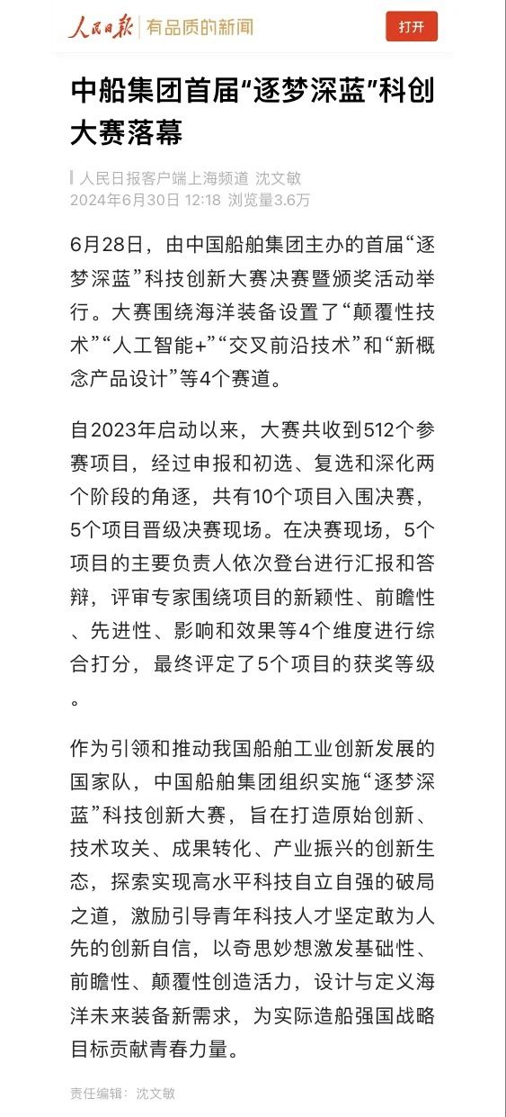中国船舶集团有限公司主办的首届“逐梦深蓝”科技创新大赛决赛暨颁奖活动引来各大媒体的关注,获得高度评价。——>活动回顾