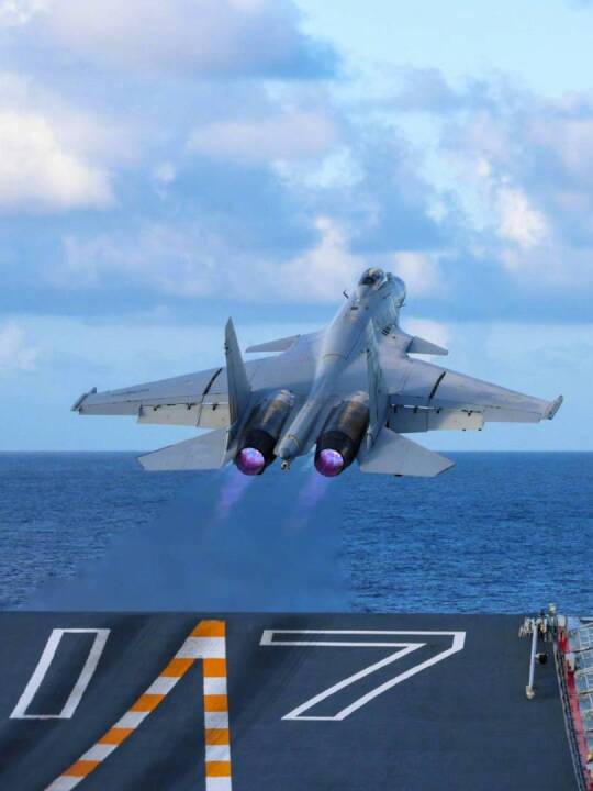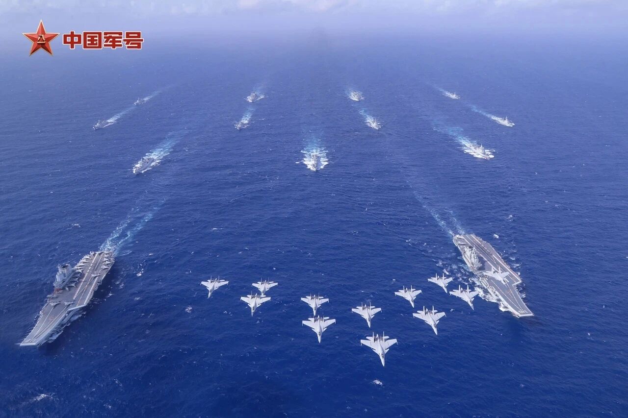 2024年10月,辽宁舰、山东舰编队首次开展双航母编队演练。歼-15战机组成楔形编队飞过双航母编队上空。
