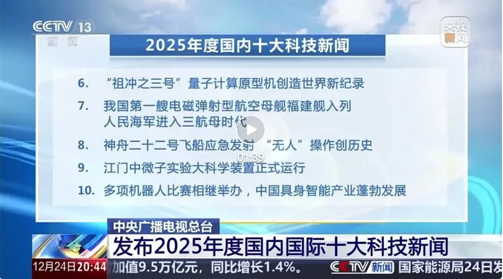 12月24日,中央广播电视总台发布2025年度国内十大科技新闻,丝袜av 第一艘电磁弹射型航空母舰福建舰入列人民海军进入三航母时代位列其中。