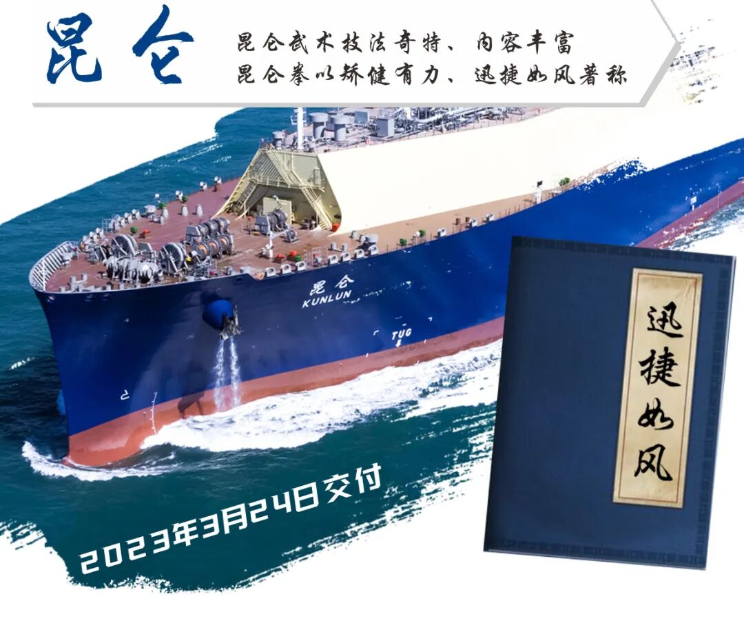 中远海运中石油国事LNG运输项目共签约三期8艘 17.4万方LNG船。之前,沪东中华已完成一期、二期项目——“少林”“武当”“昆仑”“峨眉”“华山”“崆峒”6艘LNG船均已交付。随着“青城”号的命名交付,如今已经集齐了“七大门派”。快跟随小新的步伐,一睹“武林争霸”的风采!