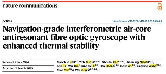 旗下七〇七所和暨南大学等构建的深度合作研究团队,在国际权威顶级期刊《Nature Communications》发表了题为“Navigation-grade interferometric air-core anti-resonant fibre optic gyroscope with enhanced thermal stability”的最新研究成果,实现了空芯光纤陀螺领域的新突破。
