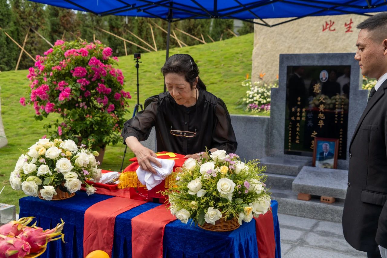 亲属代表擦拭墓碑后,在礼宾人员的引导下将黄旭华院士的骨灰安放进墓穴。人们向黄旭华院士墓碑行三鞠躬礼,并敬献鲜花,以简约而庄重的仪式,送别国之脊梁。