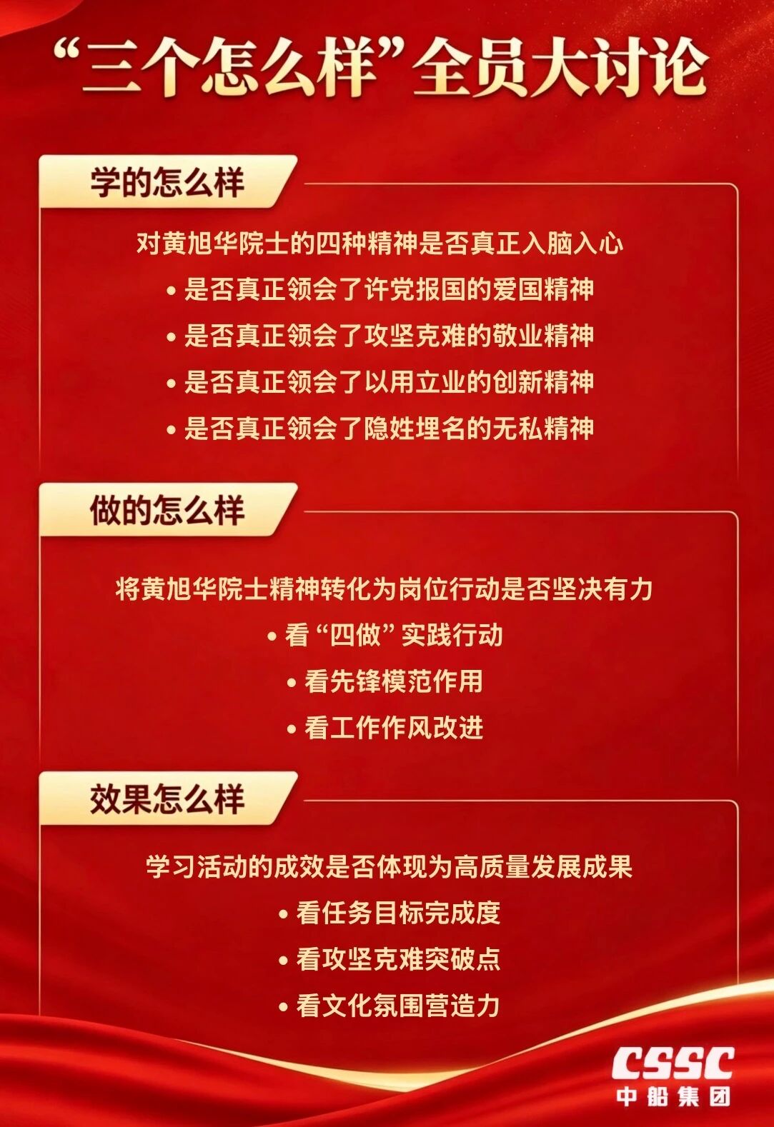党组下发通知,号召全集团开展学习黄旭华院士先进事迹“四学四做”活动“三个怎么样”(学的怎么样、做的怎么样、效果怎么样)全员大讨论。