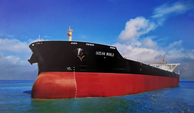 搭载七一一所轴带发电系统和前置预旋导轮、消涡鳍、舵球、螺旋桨改型等节能装置的23万吨散货船在航行中