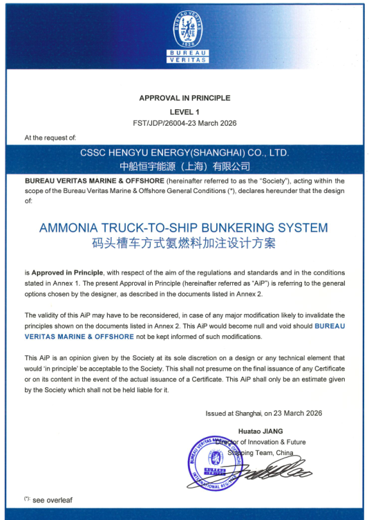 近日,中船物资恒宇能源公司氨燃料码头槽车式氨燃料加注设计方案获AIP认证。项目研发团队明确低温液氨为加注介质,锚定核心研发方向,开展全面市场调研与行业摸排,持续深耕技术路径探索,反复进行方案论证迭代,成功攻克多项技术瓶颈,最终形成安全可靠、高效便捷、可落地实施的技术方案,顺利通过严苛评审。