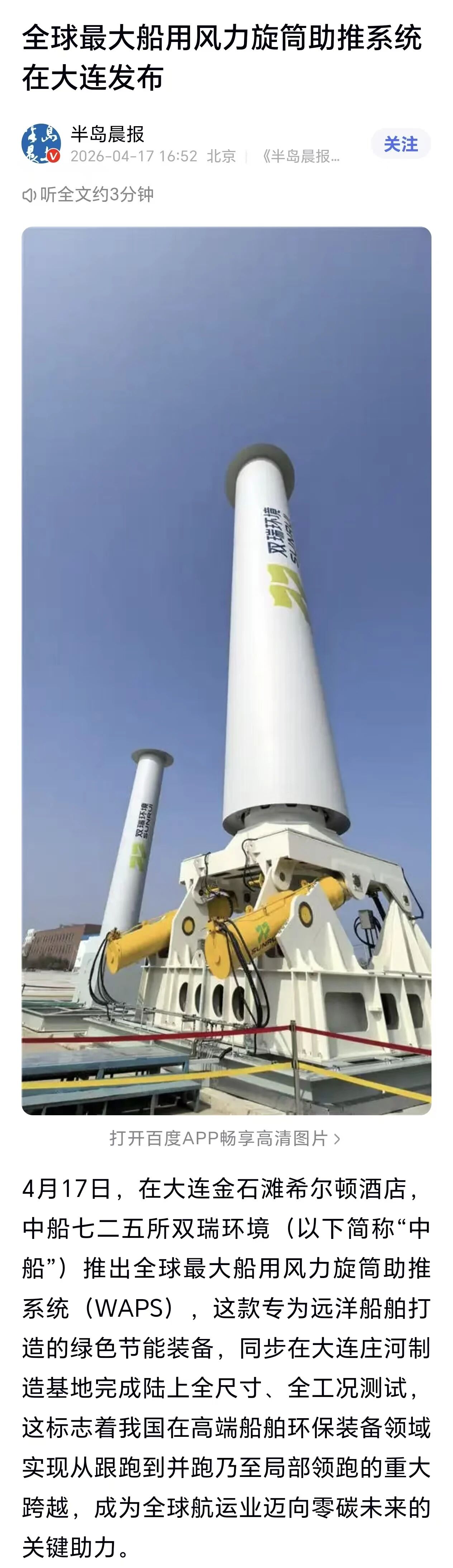 4月17日,中国船舶集团有限公司七二五所旗下双瑞环境正式发布全球最大船用风力旋筒助推系统。 央视、人民日报、新华社、科技日报、半岛晨报等多家中央及地方媒体第一时间关注报道。